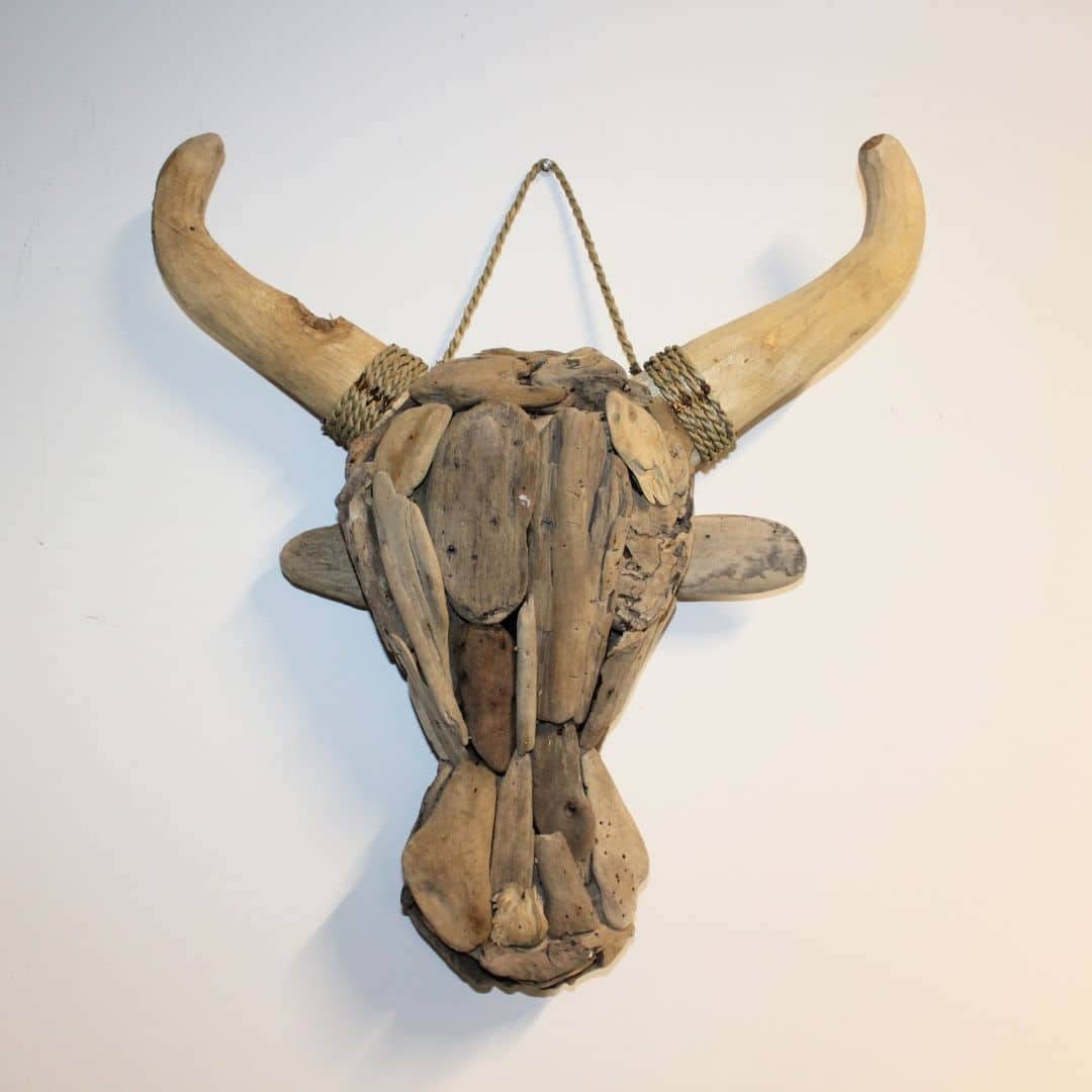 Tilføj en rustik og naturinspireret accent til din indretning med vores kohoved, skabt af drivtømmer og genbrugstræ. Denne unikke vægdekoration er både imponerende og alsidig, designet til at hænge både inde og ude.