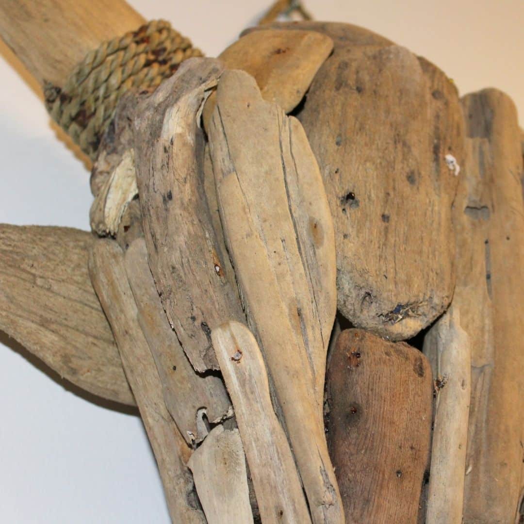 Håndlavet med omhu, fremhæver kohovedet den organiske skønhed ved genbrugsmaterialer, med hver detalje udskåret for at fange dyrets karakteristiske træk. Drivtømmerets naturlige tekstur og genbrugstræets varme farver skaber en iøjnefaldende og autentisk udsmykning, der tilføjer en naturlig charme til ethvert rum eller udendørs område.