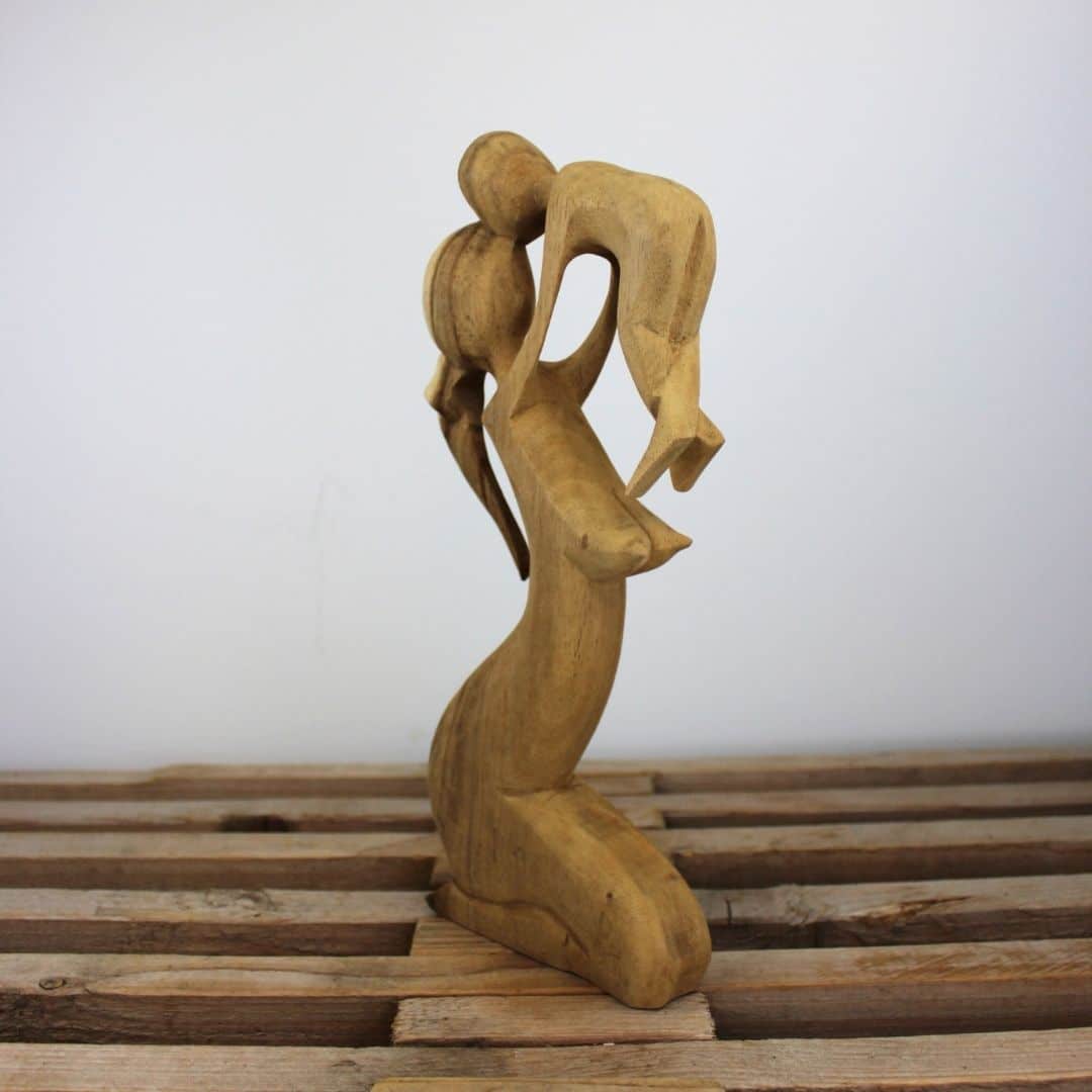 Fang øjeblikket af ren kærlighed og glæde med denne smukke figur af en mor, der løfter sit barn op i luften, håndlavet i teaktræ.