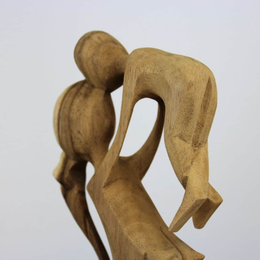 Denne elegante og følelsesladede skulptur fremhæver det stærke bånd mellem mor og barn og er udført med stor omhu for at vise teaktræets naturlige skønhed. Træets varme toner og glatte overflade giver figuren en tidløs appel, som passer perfekt til enhver indretning.